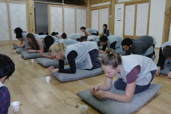 After we finished we had made a wonderful meditation necklace. You are supposed to close your eyes and say Namu Amita Bul (namu-ammi-tabul) while touching a bead, and repeat the word 108 times. The word literally translates to mean “Homage to Infinite Light.” I have done it at home and it actually works! I didn’t do the bowing though, I’m a lazy American. After the bowing, we got to eat some more temple food. This time the food wasn’t AS bad as dinner, I could actually stand to chew it this time, but it definitely wasn’t good. My favorite part of the temple stay was after breakfast, when we were led up a small nearby mountain to meditate in the nature. We listened to “earth’s music” and I actually fell asleep, I was so relaxed! It was so peaceful up there, despite us being able to see the DMZ from where we were- which was about 3-4 miles away! (we were actually on a military base- so cool!)
